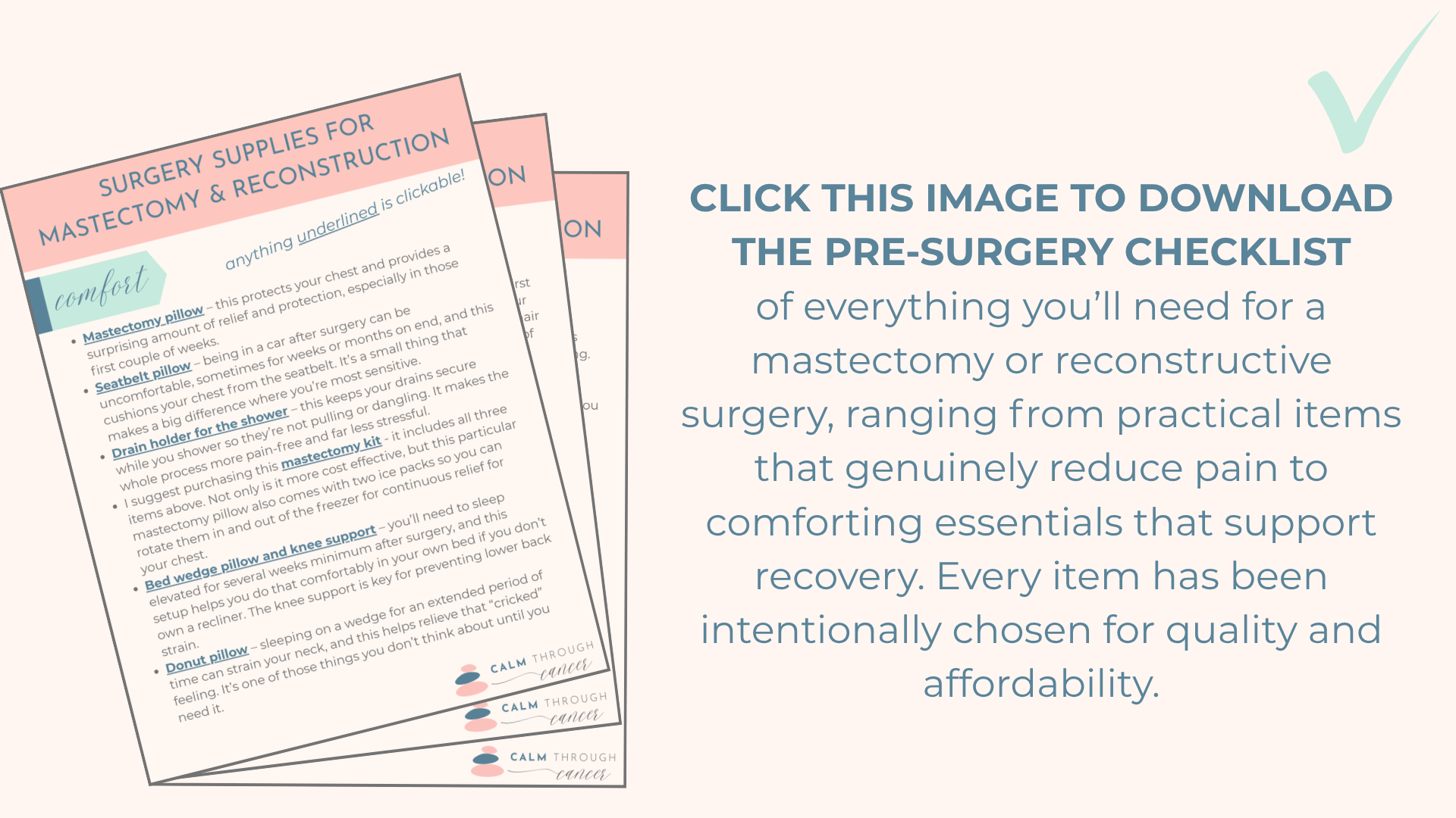 You'll receive full, lifetime access to the complete eight-week program and access to a private online community. You’ll also receive Founders Pricing and the opportunity to play a meaningful role by shaping the curriculum through your feedback. Interested in joining the Beta Group? Email amy@calmthroughcancer.com.