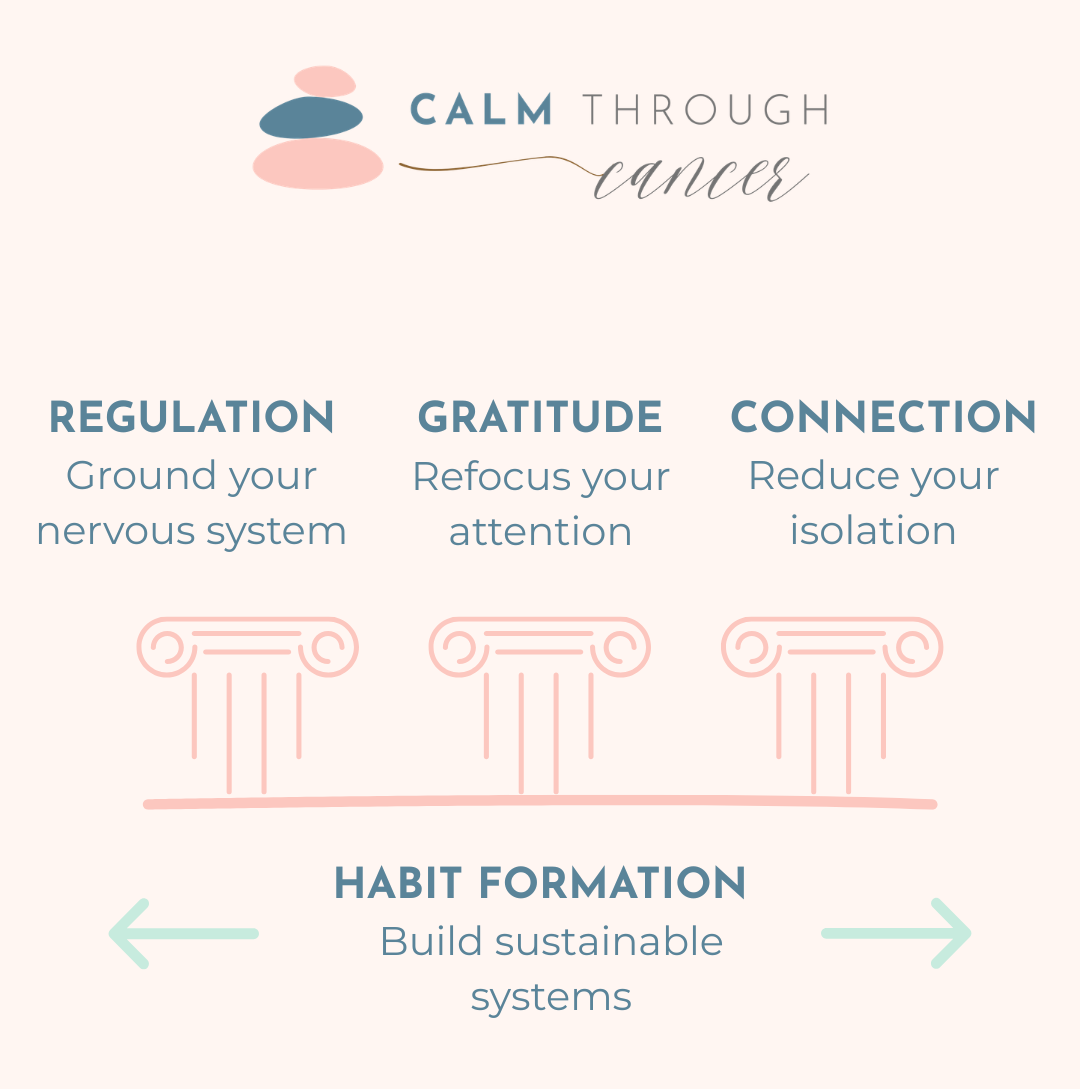Calm Through Cancer is built around four integrated pillars, meaning that each week you’re learning, practicing and connecting strategies that actually work in the real-world context of navigating breast cancer. Because one of our pillars is Habit Formation, you’ll establish routines that continue supporting you long after the course ends.
